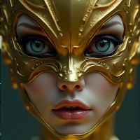 a golden mask on its face. The mask is intricately designed, resembling the head of a bird or