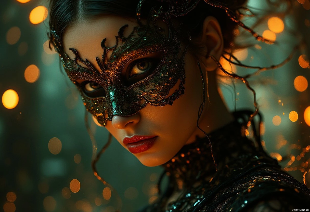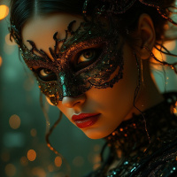 a young woman with brunette hair. She has her head slightly tilted and her gaze directed towards the camera, giving her an introspective appearance. The woman is wearing an elaborate black mask that covers most of her face, adding