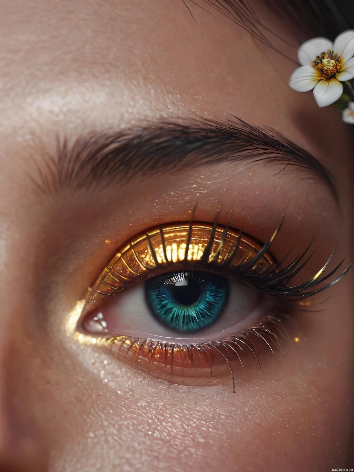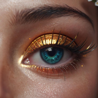 striking effect that resembles gold foil wrapping paper or gold leaf. The person has a blue iris visible in their eye, which stands out against