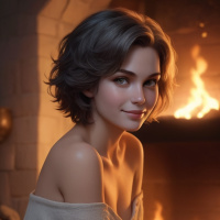 a gentle smile and her knees are drawn up slightly towards her chest, giving the impression that she's comfortably seated by the warmth of the fire. Her attire appears to be casual and comfortable, suitable for lounging or relaxing indoors. The ambiance suggests a cozy and intimate setting.