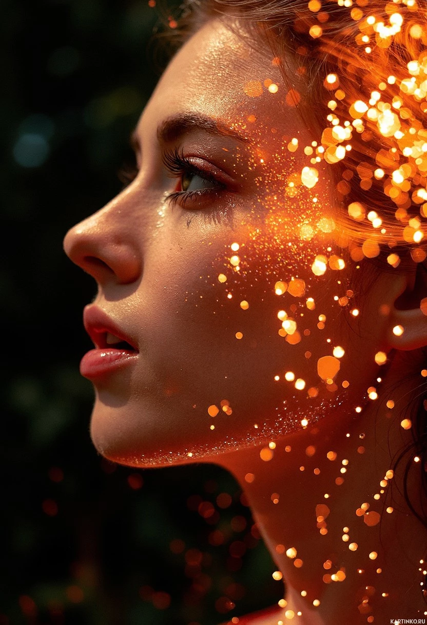 The image shows a woman with her face partially visible, and her body is adorned with what appears to be sparkles or glitter. There are orange and yellow specks of light or particles scattered around her, giving the impression that she is emitting them or that they are falling onto her. The background is blurred but suggests