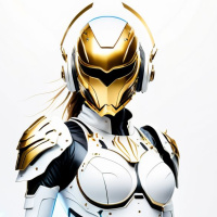 a female character dressed in futuristic armor. She has a sleek design with metallic and white elements, including what appears to be a helmet or headgear that is predominantly gold-colored, suggesting a high-tech theme consistent with