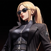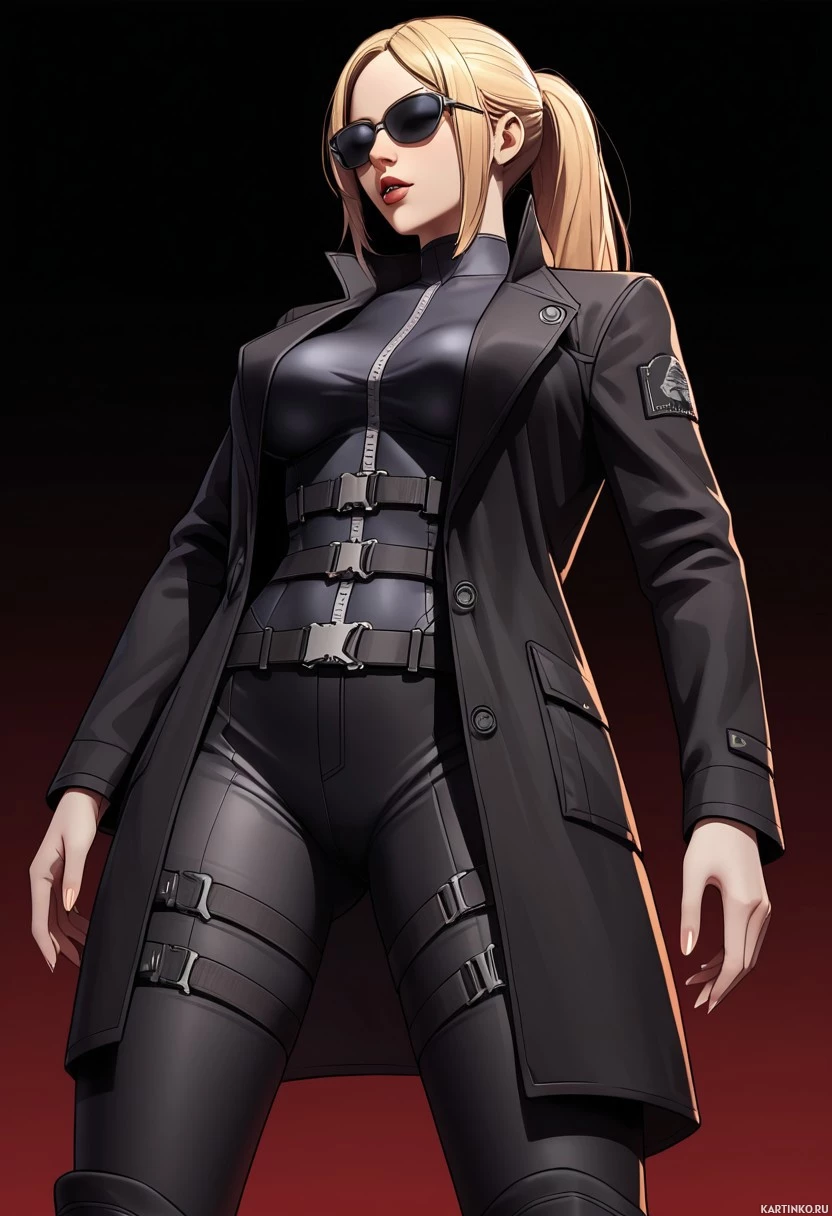 blonde hair and is wearing a sleek black jacket with numerous straps and buckles, suggesting a gear or armor-like outfit. There are visible chains and belts on the costume, giving it an edgy,