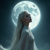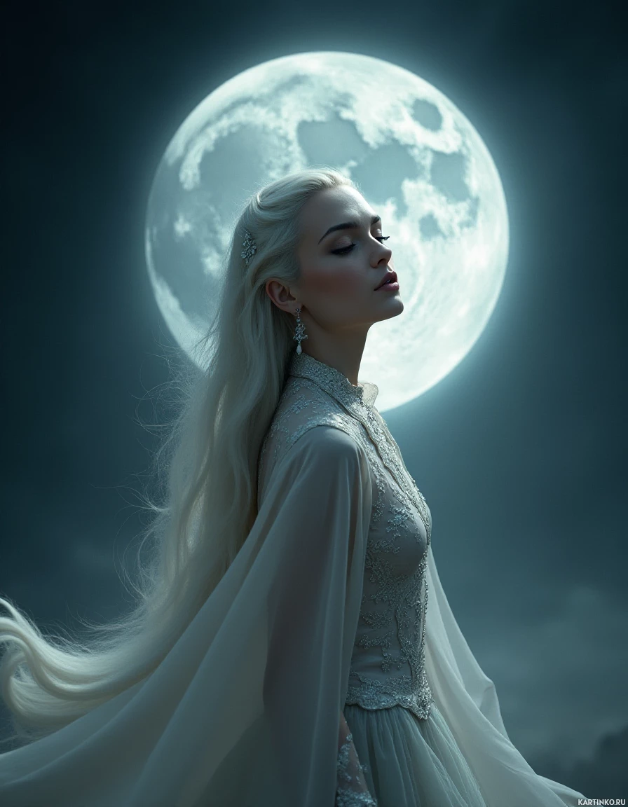dark sky filled with clouds that appear stormy, hinting at an upcoming tempest. Dominating this backdrop is a full moon, its brightness contrasting sharply against the gloomy atmosphere. The woman's gaze is directed towards the moon, adding to the ethereal and otherworldly feel of the scene. The overall mood of the image is one of serene melancholy, with the beauty of the woman and her surroundings being accentuated by the dramatic lighting and setting.