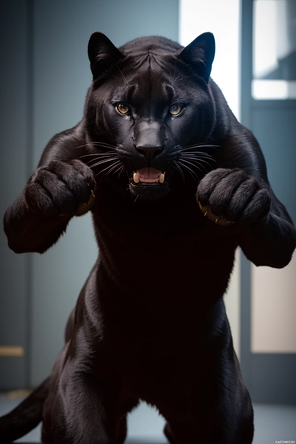 video games for its fierce appearance. The panther's muscles are tense as if it is ready to spring into action or defend itself. Its eyes are focused forward with