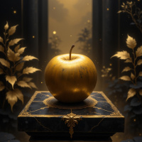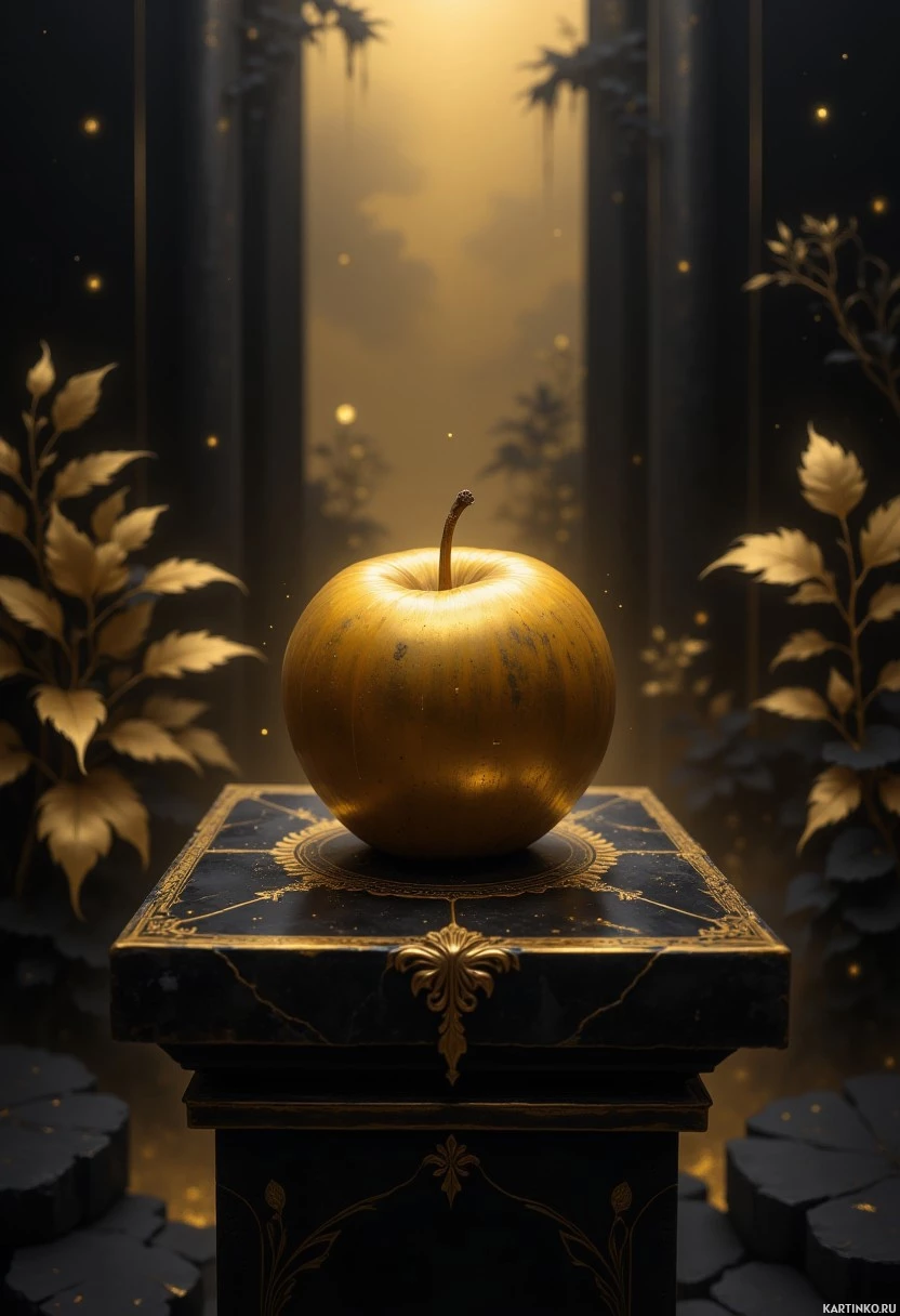 a golden apple with a stem on it, placed atop a small, ornate pedestal. The setting is a mystical or enchanted forest, featuring tall, slender
