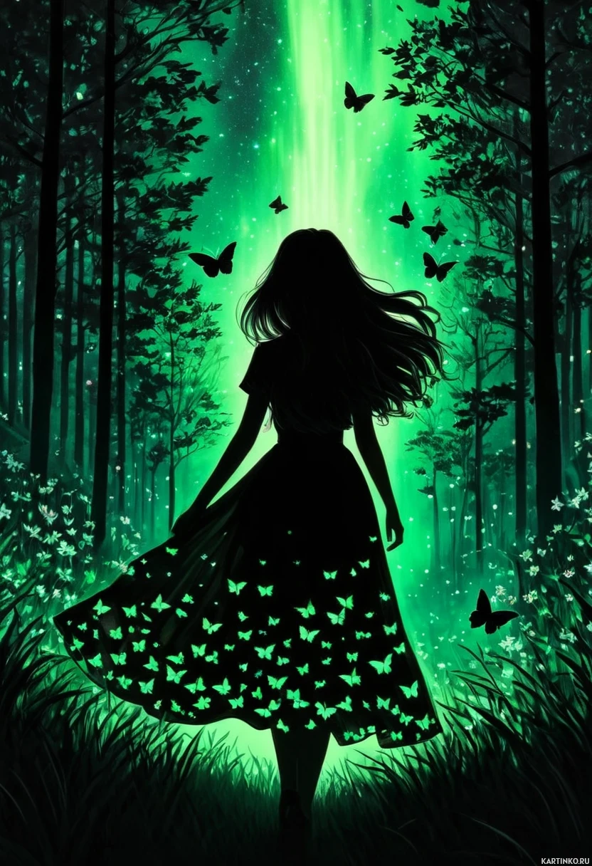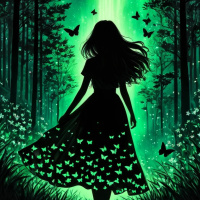 nocturnal illumination. The girl's dress has a pattern that includes more butterflies, which contributes to the theme of the image.