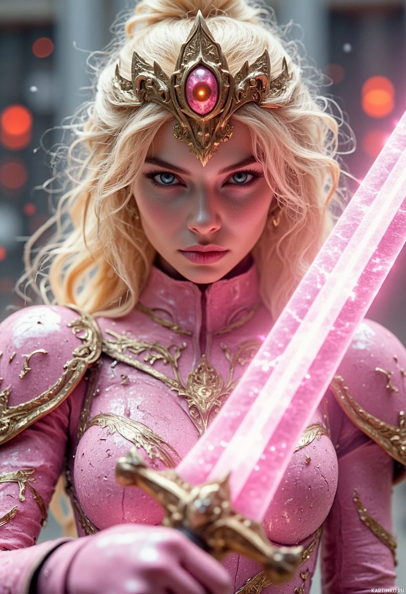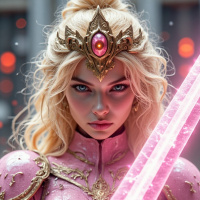 a serious expression. In her right hand, she holds a pair of pink swords crossed over each other, giving the impression of being battle-ready. The backdrop suggests