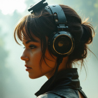 In the image, there is a woman who appears to be wearing headphones. She has shoulder-length