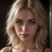 blonde hair and a fair complexion. Her makeup includes defined eyebrows, long eyelashes, and eyes that are looking directly at the camera, which gives her