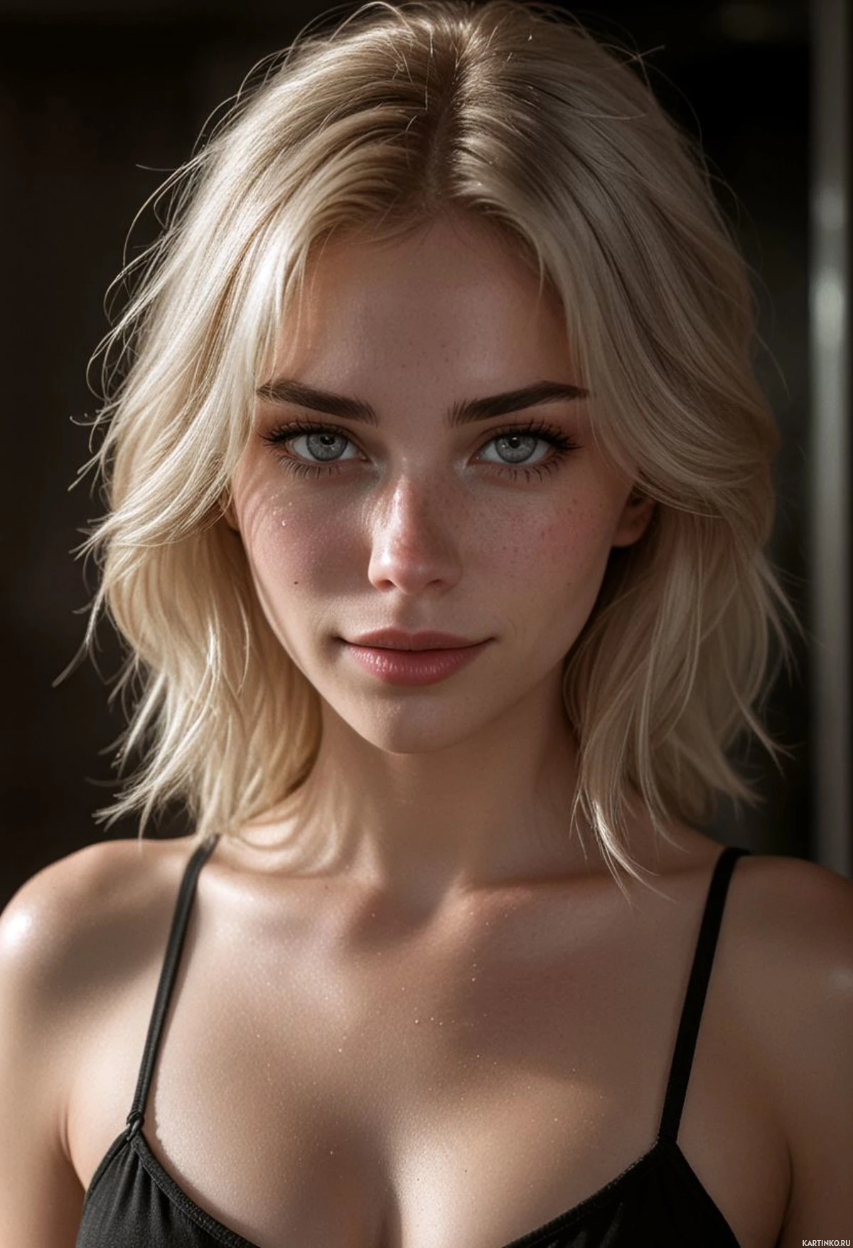 chest area. The lighting in the photo casts a shadow across her body, suggesting she might be standing in front of a window or under a bright