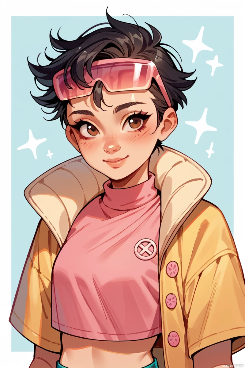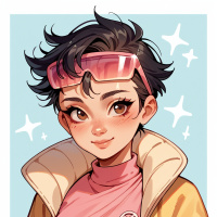 a yellow jacket over a pink shirt. Her attire also includes what appears to be a pair of goggles resting on her head and a necklace around her neck. The character is smiling at the viewer, suggesting a friendly or cheerful demeanor. There are sparkling stars above the girl's head, indicating