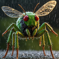 The image depicts a green and red insect, which appears to be a grasshopper, perched on a surface that is wet from rain. The insect has its wings outstretched behind it, and there are