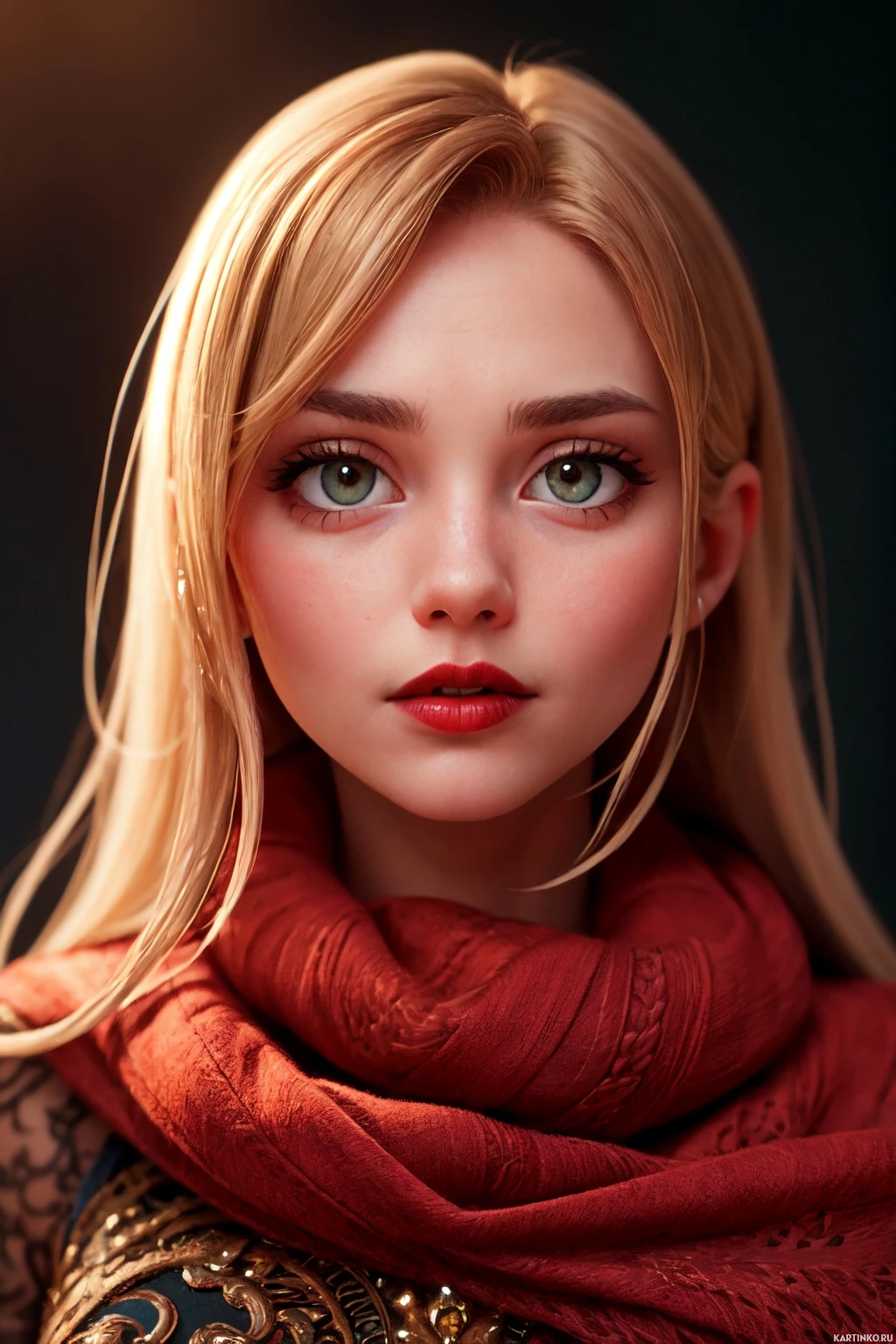a warm ambiance. There is a scarf draped around her shoulders, adding to the overall elegance of her attire. Her gaze is directed slightly away from the camera, giving her a contemplative appearance.