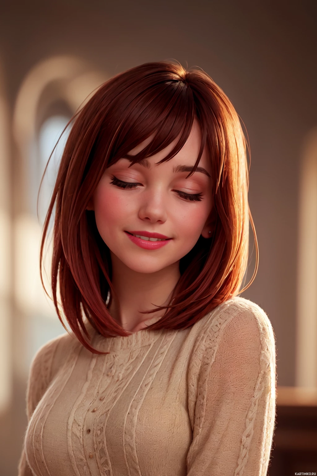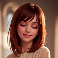 red hair styled in a layered cut that falls over her shoulders. Her skin tone is light, and she appears to be wearing