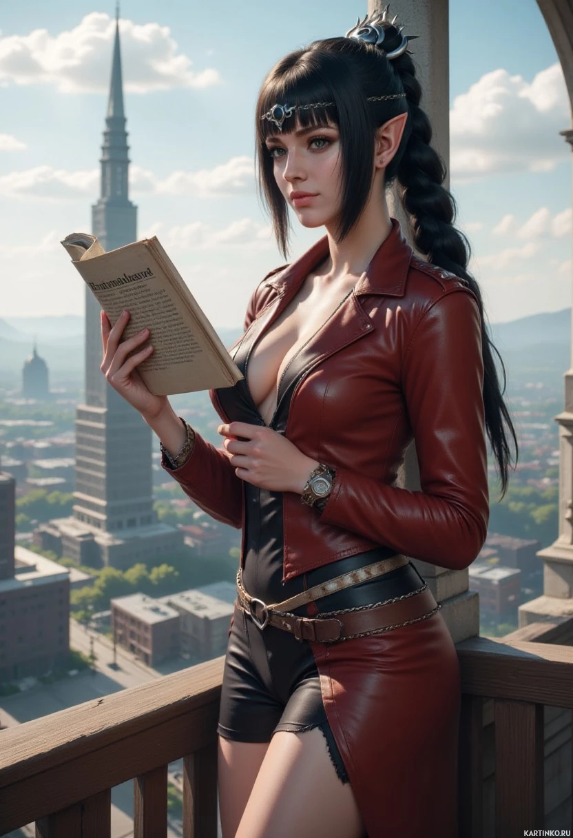 leather jacket over a black tank top, paired with shorts that seem to have armor-like detailing, and she is holding a book in one hand while the other hand rests on the railing of a balcony. The setting suggests