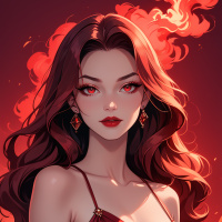 long hair cascades down past her shoulders, adding to her poised demeanor. Surrounding her are flames, suggesting a theme of fire or a passionate nature. The overall color palette is dominated by