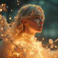 The image features a person with long blonde hair wearing makeup that accentuates their eyes and lips. They are dressed in an attire that has reflective elements, giving off the appearance of sparkles or light glints. Around them are delicate white flowers, possibly cherry blossoms, which are also illuminated by small lights, creating a contrast between the soft petals and the bright glow from the lights. The setting appears to be outdoors during dusk or dawn given the natural lighting.