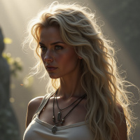 blonde hair standing in what appears to be a natural, outdoor setting. She has