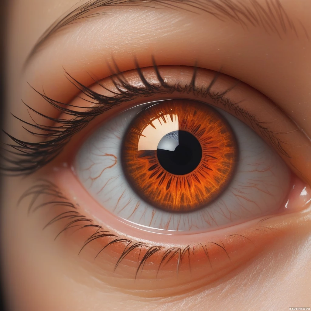 view of an eye. The iris has a unique color pattern, which appears to be a combination of orange and brown hues with a darker area at the center, resembling the appearance of a sunset or a maple