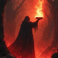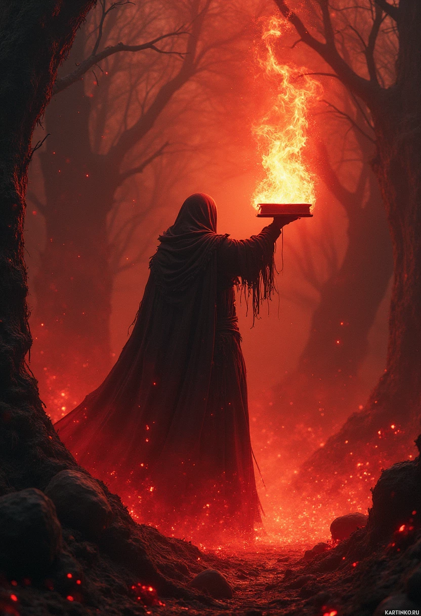 forested area with glowing red elements, possibly lava or embers, surrounding the figure. It's a dramatic and fantastical scene, evoking