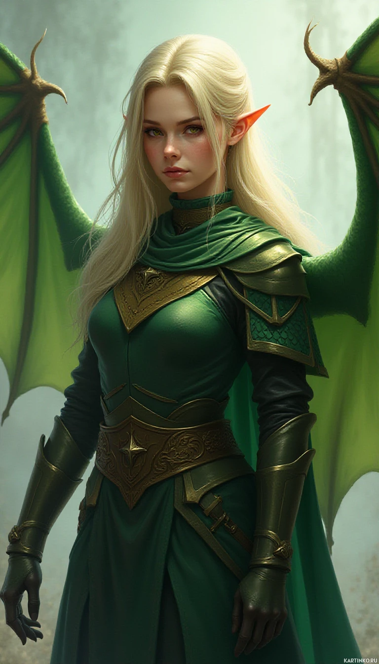 green armor and a cloak, suggesting she might be a warrior or guardian type within her story's context. The clothing is detailed with