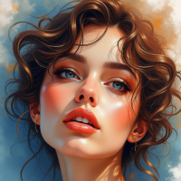 subtle makeup that accentuates her features, such as the rosy cheek tones and a hint of pink or blush on her cheeks. The background has