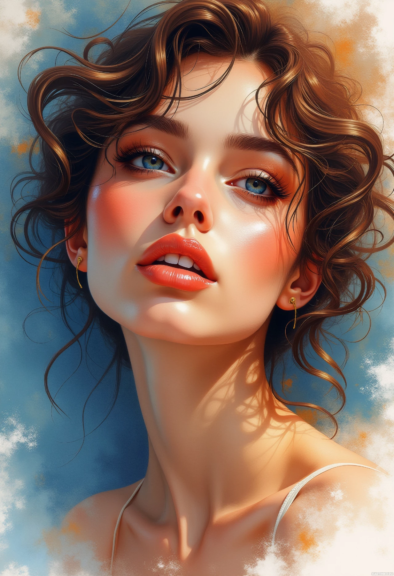 a soft gradient transitioning from blue at the top to lighter shades near the bottom. There is a slight reflection or light source coming from the upper left side of the image, casting gentle highlights across her features.