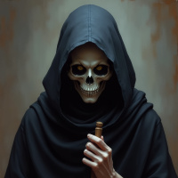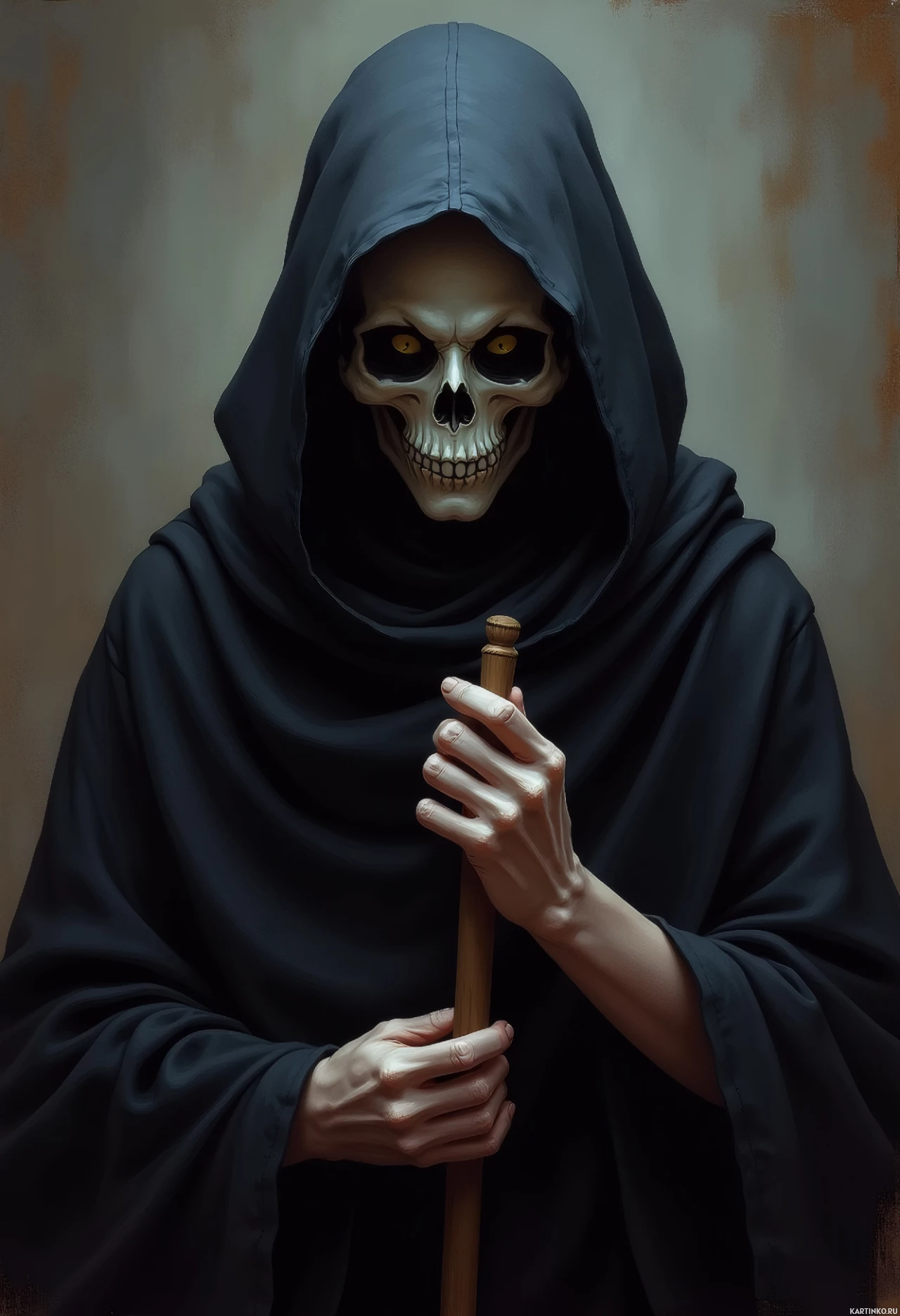 a hooded cloak and a skull for a face. They are holding what looks like a staff or rod with one hand, suggesting an emblem of authority or command over life and death. The art style leans towards