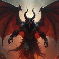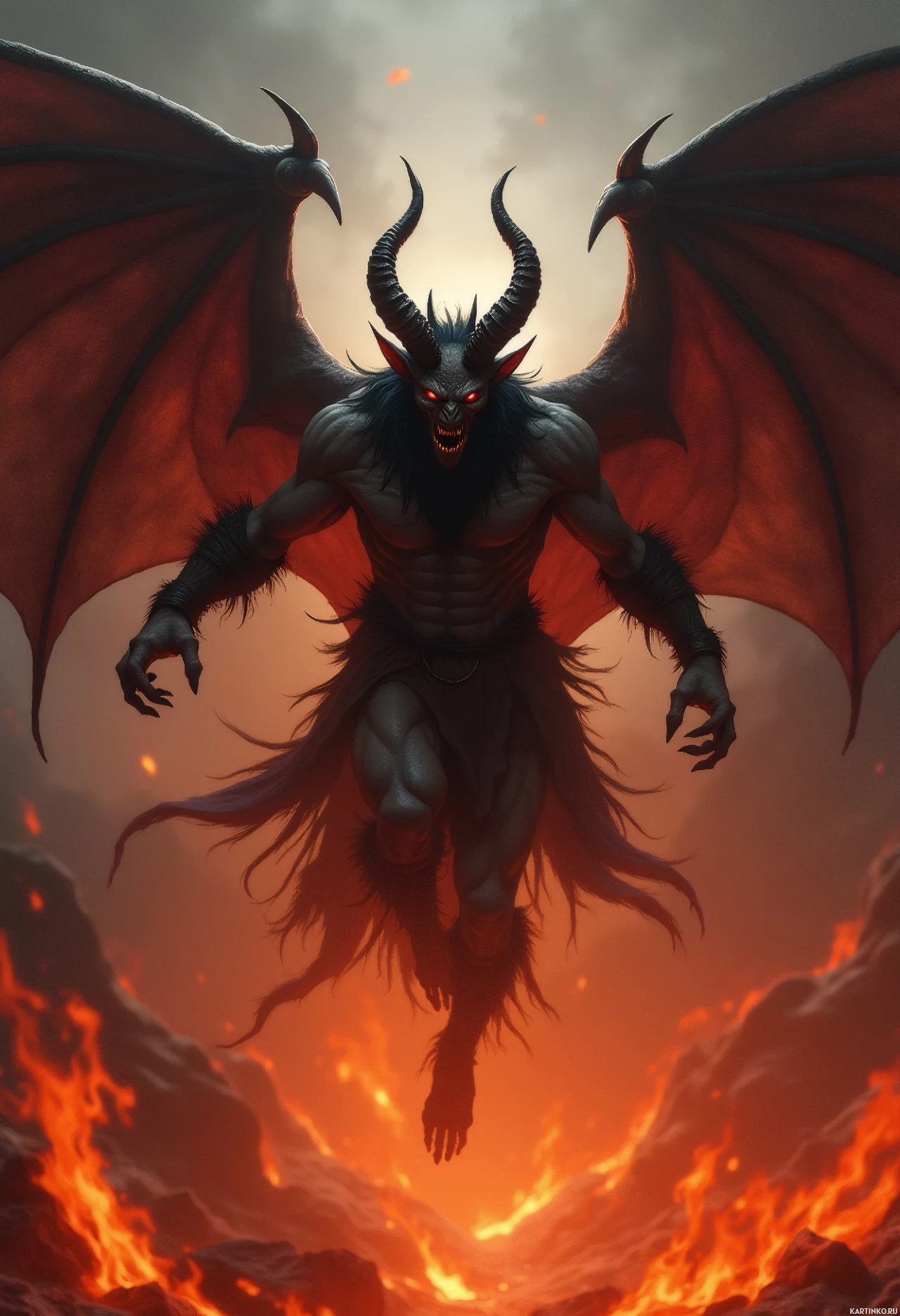 sharp teeth, horns, and pointed ears that are characteristic of demons or mythical beasts. It stands on an inferno background with flames all around, suggesting
