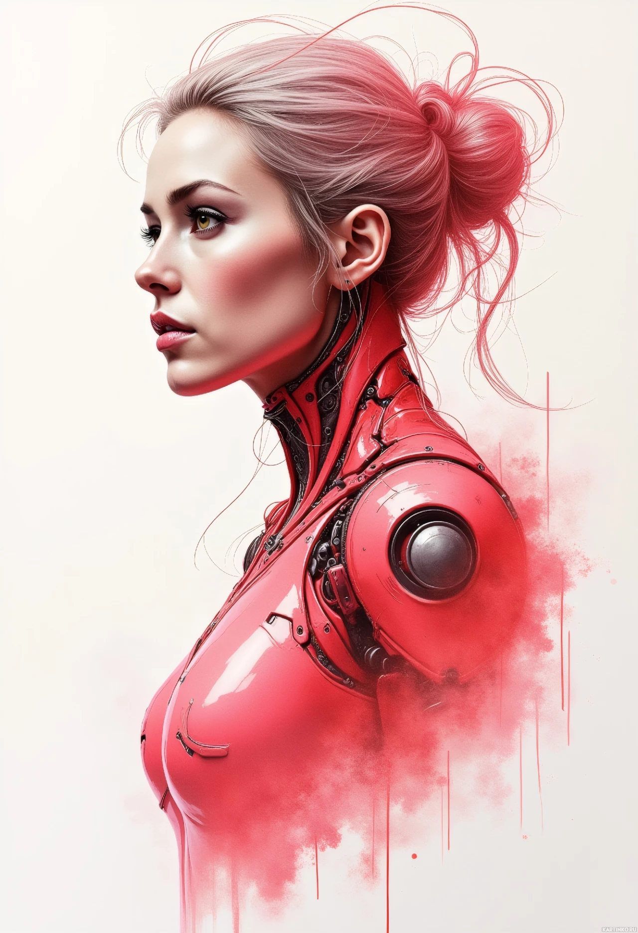 pink hair styled into a high bun and is wearing futuristic armor in a red color. The armor is sleek and modern, suggesting advanced technology or science fiction elements. Her expression is serious, with her gaze directed slightly to the side, which adds to the intensity of the image.