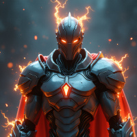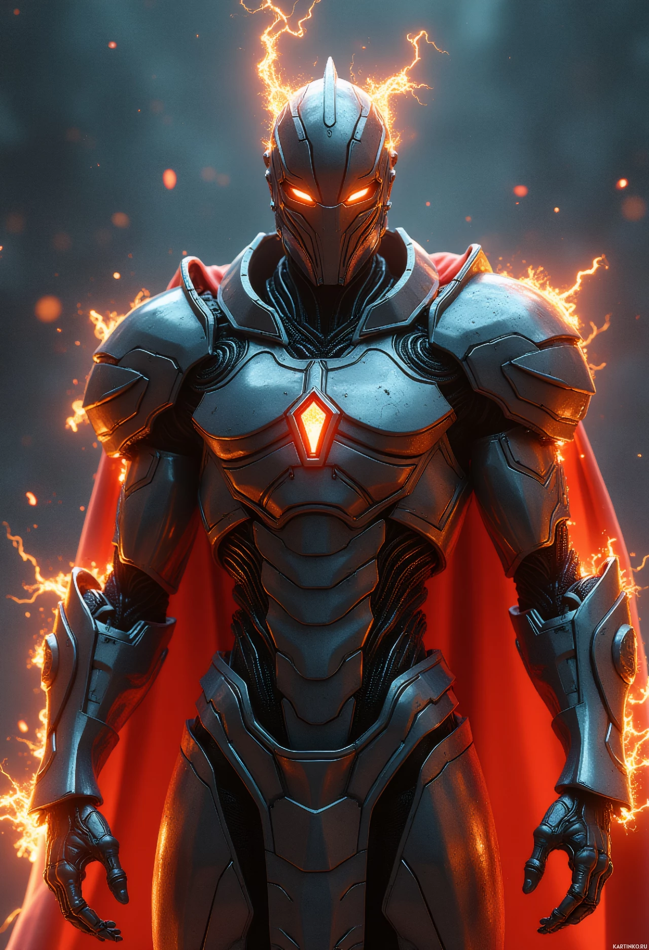 futuristic armor, which is detailed and appears to be made of metal or steel. This character is also wearing a helmet that covers the head and a cloak that drapes around the shoulders. The armor has a dark color scheme with highlights that suggest it might be reflecting light or energy. There are effects on the image that give the impression of sparks or electrical discharge, possibly indicating