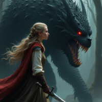 На картинке запечатлена юная девушка с золотистыми волосами в средневековой одежде: зеленое платье и коричневые сапоги. В правой руке она держит меч и смотрит вдаль. Перед ней стоит крупное, волчье существо с колючей шерстью и острыми зубами, принимающее агрессивную позу, с открытой пастью, словно рычащее или скалящееся. Задний план – туманный лес с древними деревьями, окутанный таинственной атмосферой.