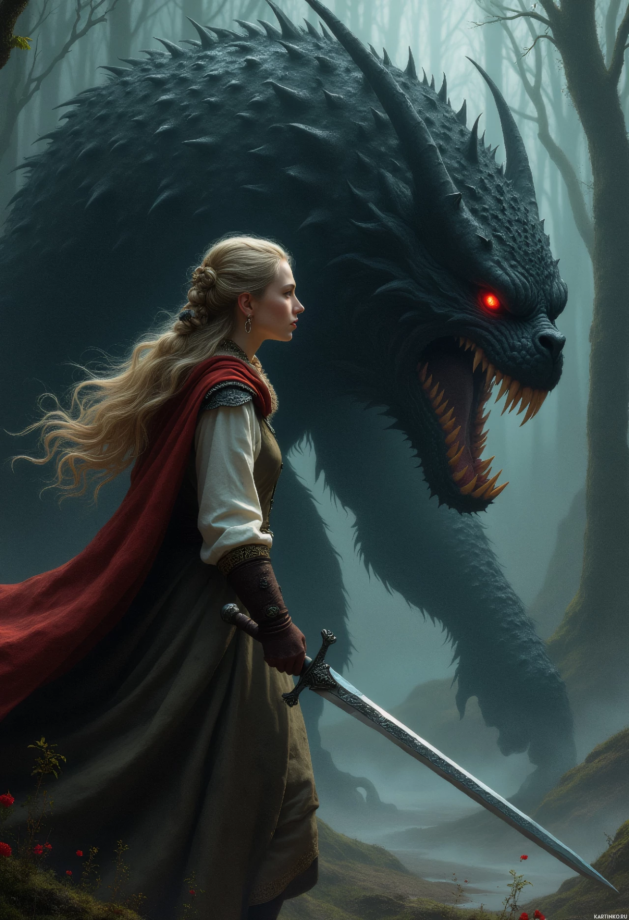 blonde hair and is dressed in armor, with a sword sheathed at her waist. Behind her stands a massive creature that resembles a dragon or monster; it has sharp teeth and