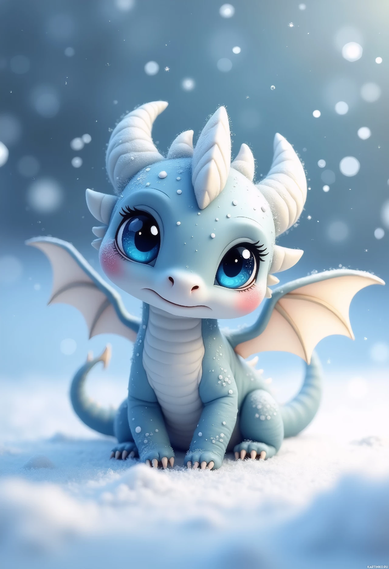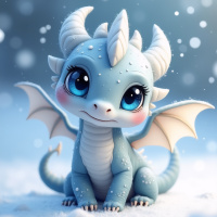 expressive eyes and is designed to appear friendly or endearing, which might appeal to viewers who enjoy cute artwork. The snowflakes falling around the dragon suggest a winter setting, adding