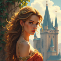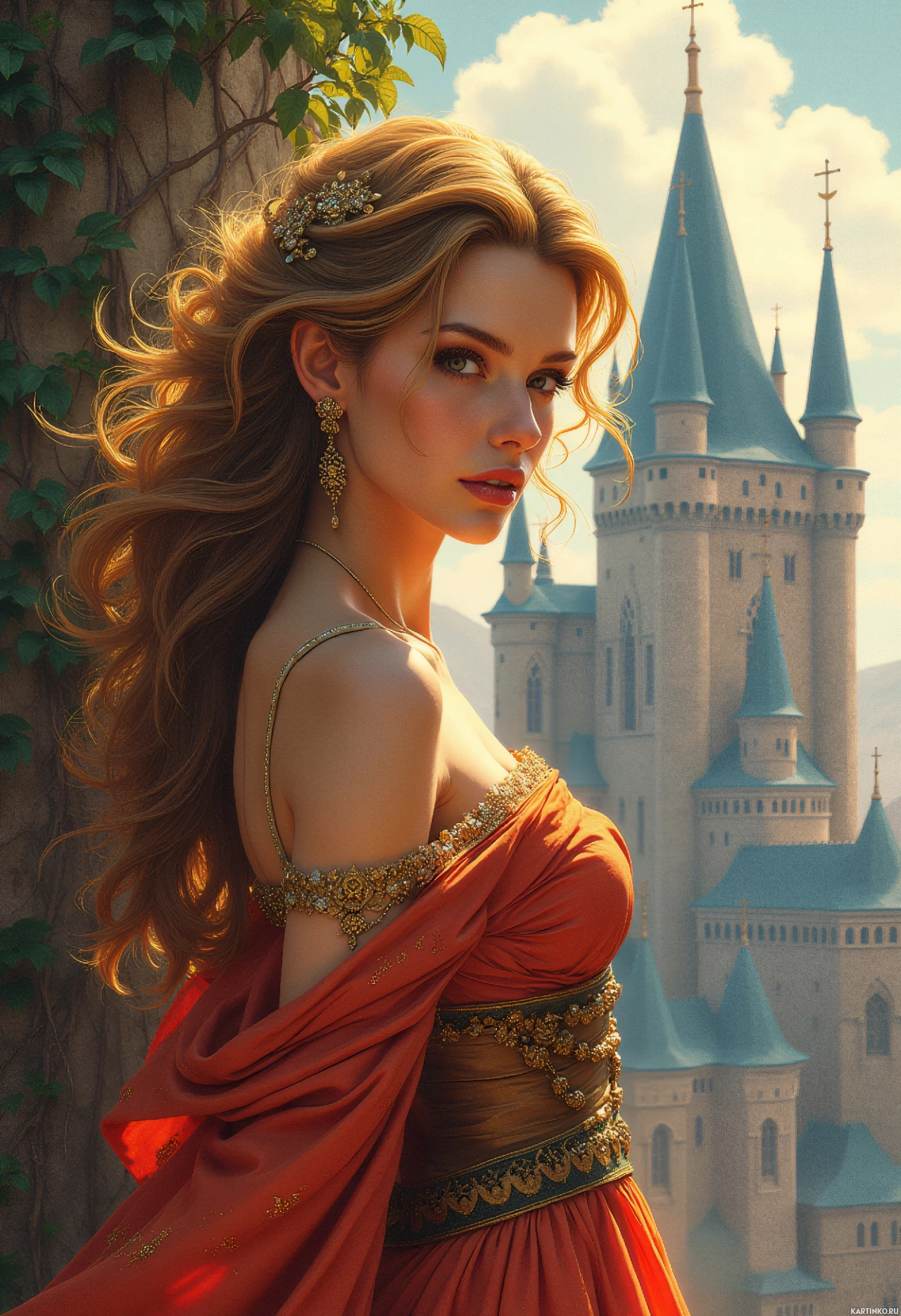 a rich texture and seems to be designed with intricate details. Behind her, there is a picturesque castle that is surrounded by greenery, suggesting a fairy-