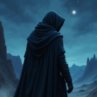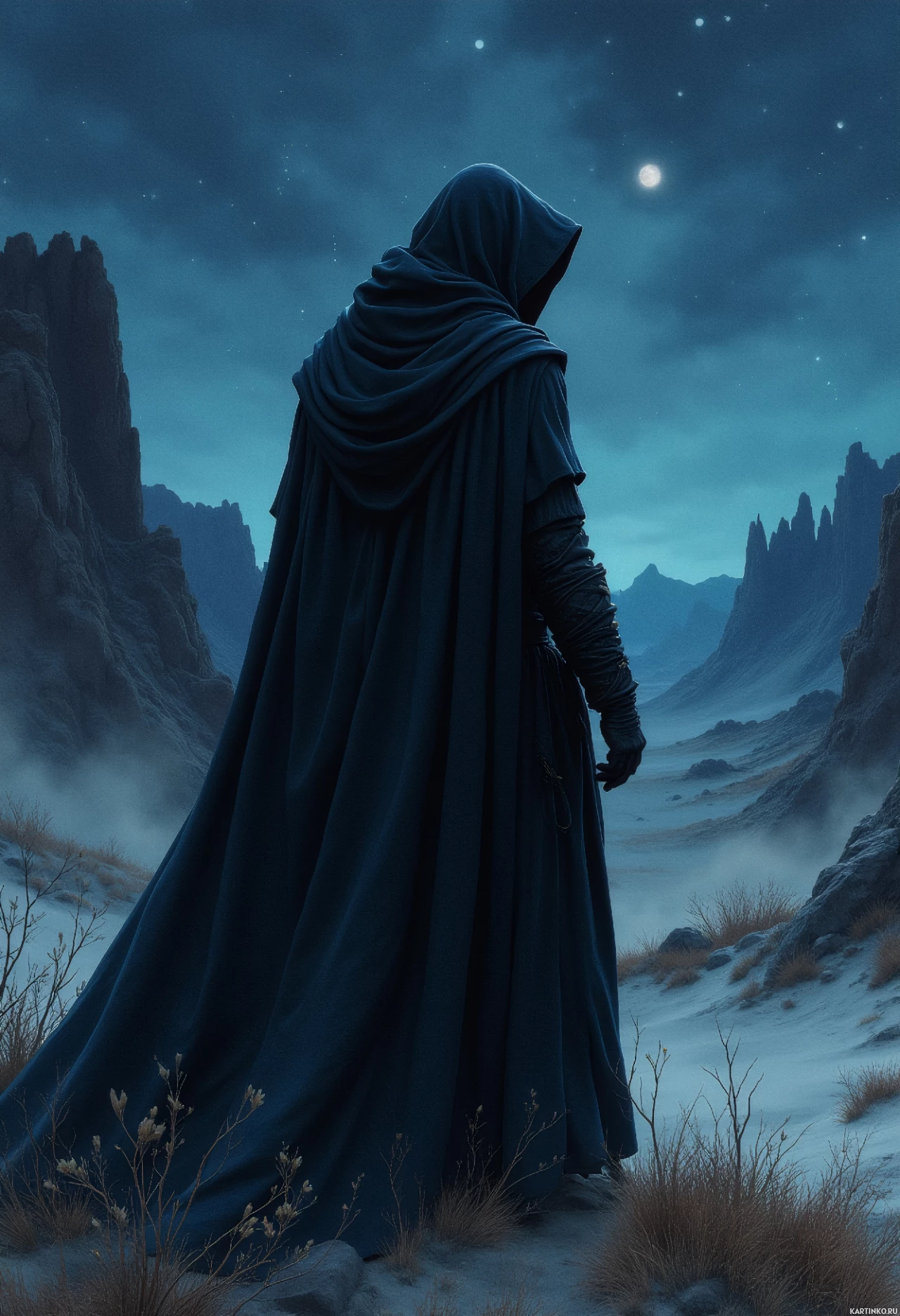 night setting is emphasized by the presence of stars in the sky and the shadowed silhouette of the character against the background. The overall mood of the picture conveys solitude or contemplation, possibly hinting at a narrative that involves themes like mystique, adventure, or isolation.
