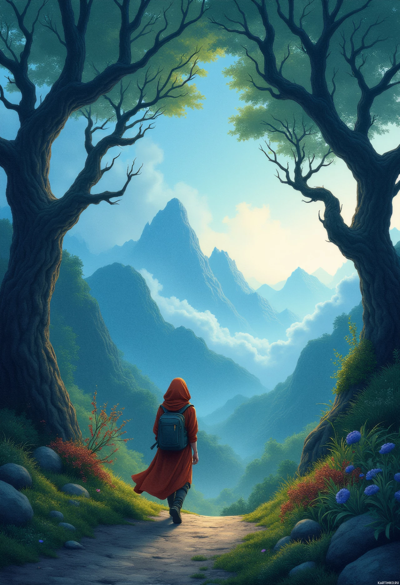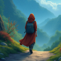 a hooded cloak that drapes over their shoulders and down their back. They are also carrying a backpack on their shoulders. The individual appears to be walking towards a forest or mountainous area, as indicated by the trees and misty