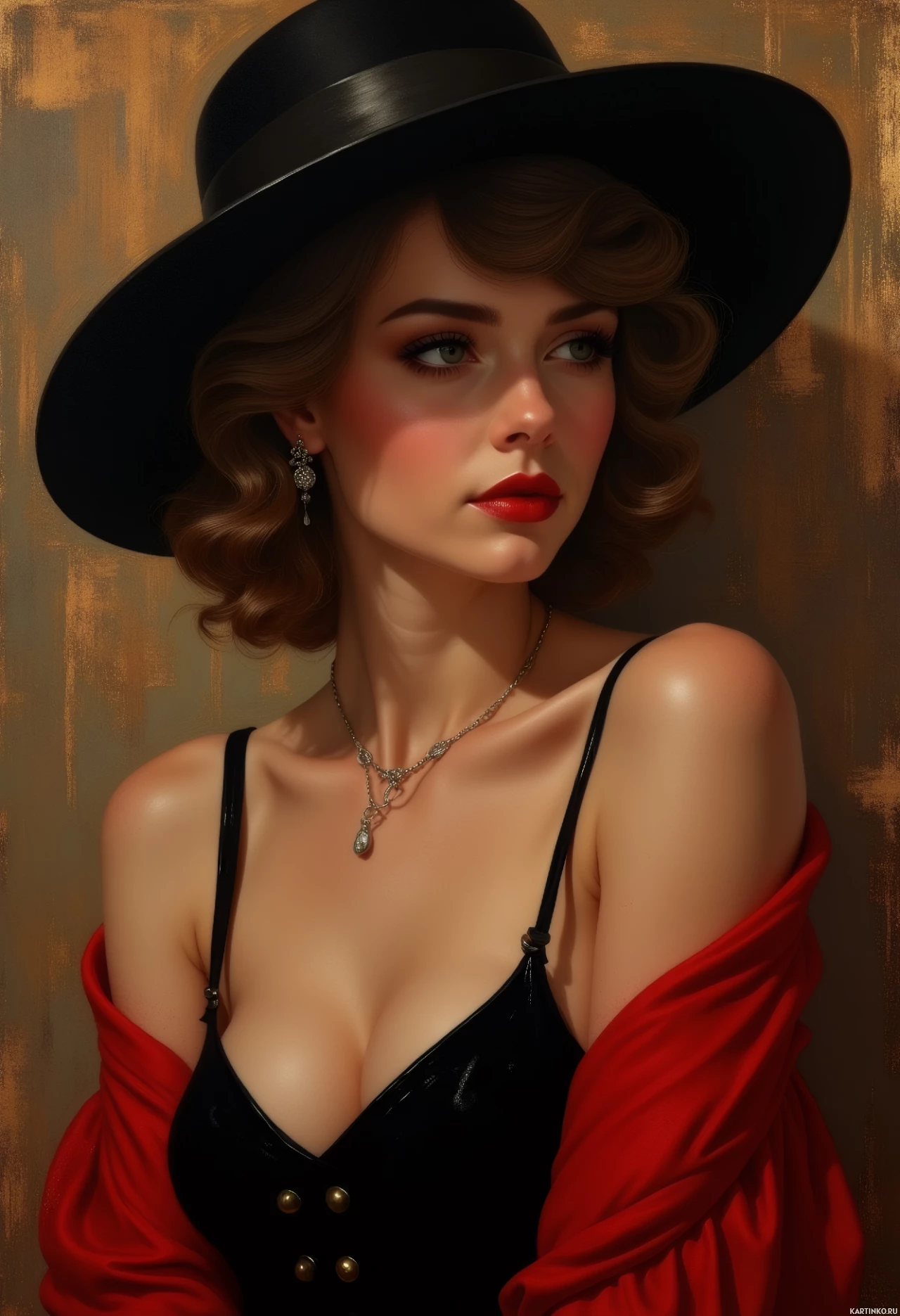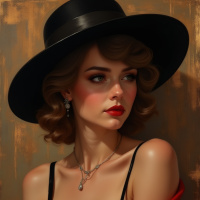 curly hair and is wearing a black hat with a wide brim, which gives her an elegant appearance. Her