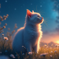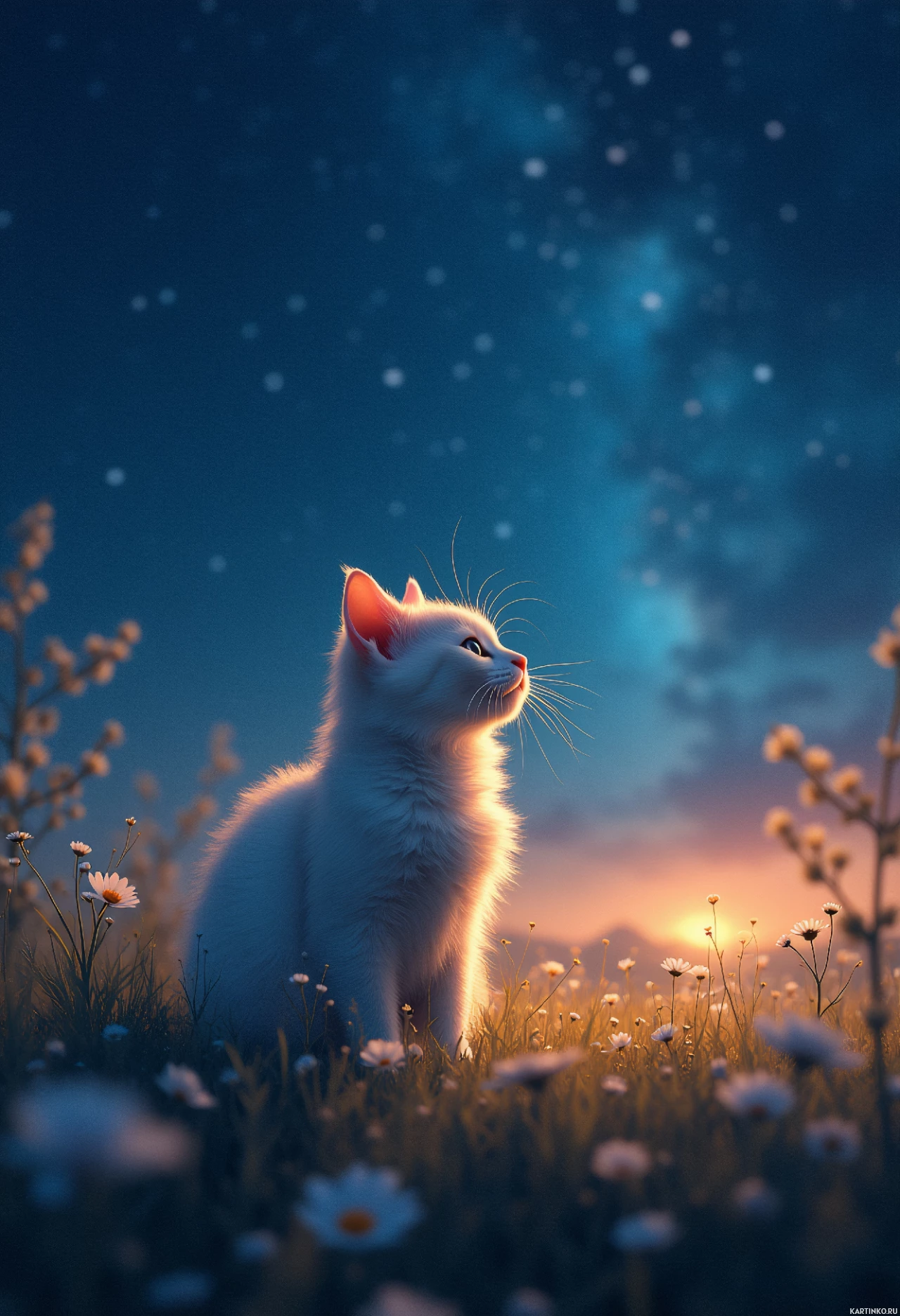 На картинке маленький котенок сидит на лугу. У него светлая шерстка, возможно, белая с темными отметинами, а глаза смотрят вверх, к небу. Небо изображено в сумерках, когда начинают появляться звезды – похоже, это либо рассвет, либо закат. На заднем плане виден светящийся закат или восход луны, создающий теплое сияние и контрастирующий с холодным синим цветом ночного неба. Картинка создает ощущение умиротворения и созерцания.