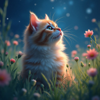 The image depicts a stylized illustration of an orange tabby cat sitting on a grassy area at night under a starry sky with visible constellations. The cat is looking upwards, towards the stars, and appears to be gazing intently at something not directly visible in the image. There are small pink flowers, resembling wildflowers, scattered around the cat's feet. The overall atmosphere of the picture is serene and mystical, with a blend of natural elements and celestial themes.