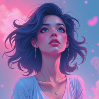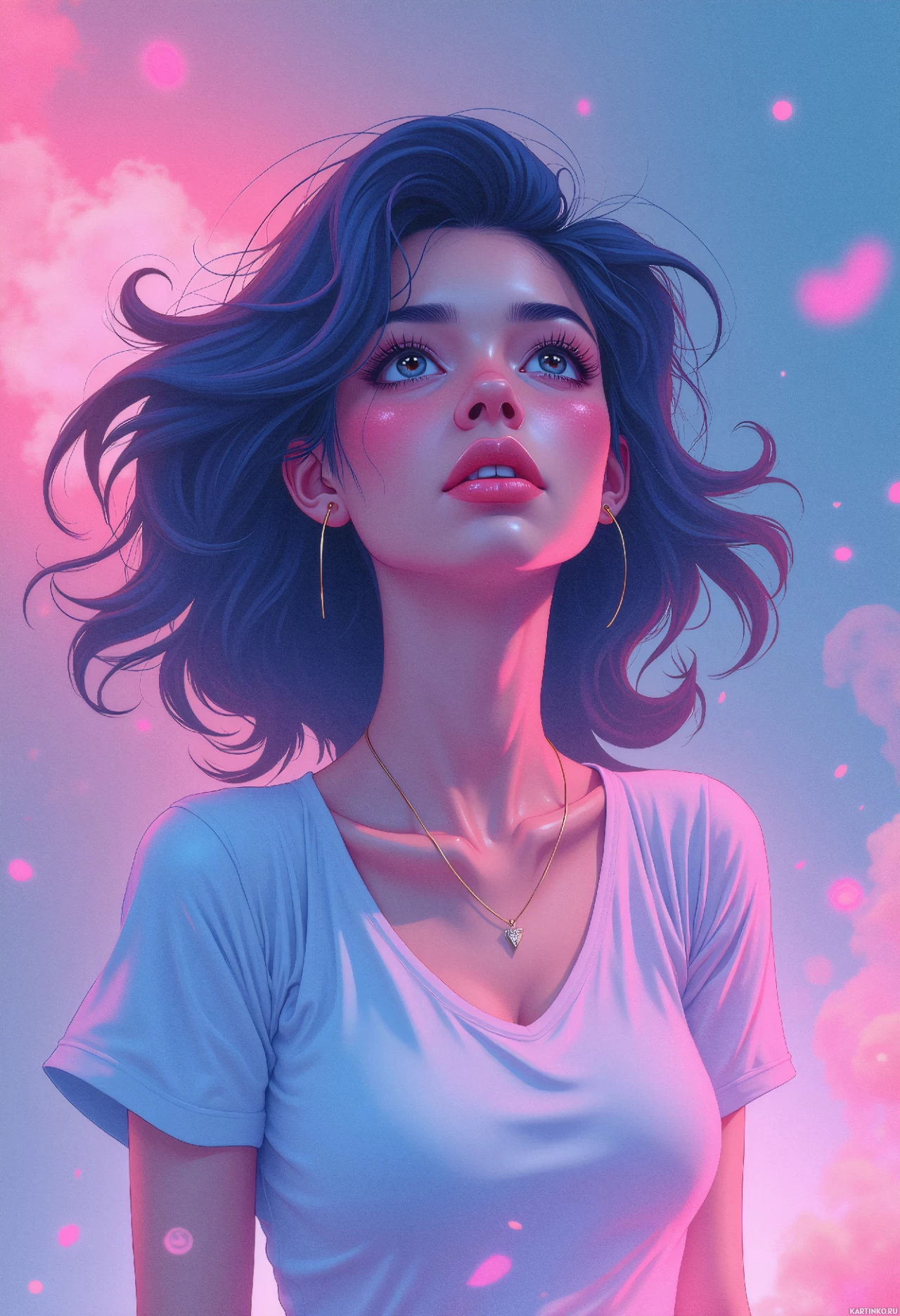 blue hair and pink accents around her eyes, which could suggest she is part of an animated or fantasy genre. She is wearing a simple