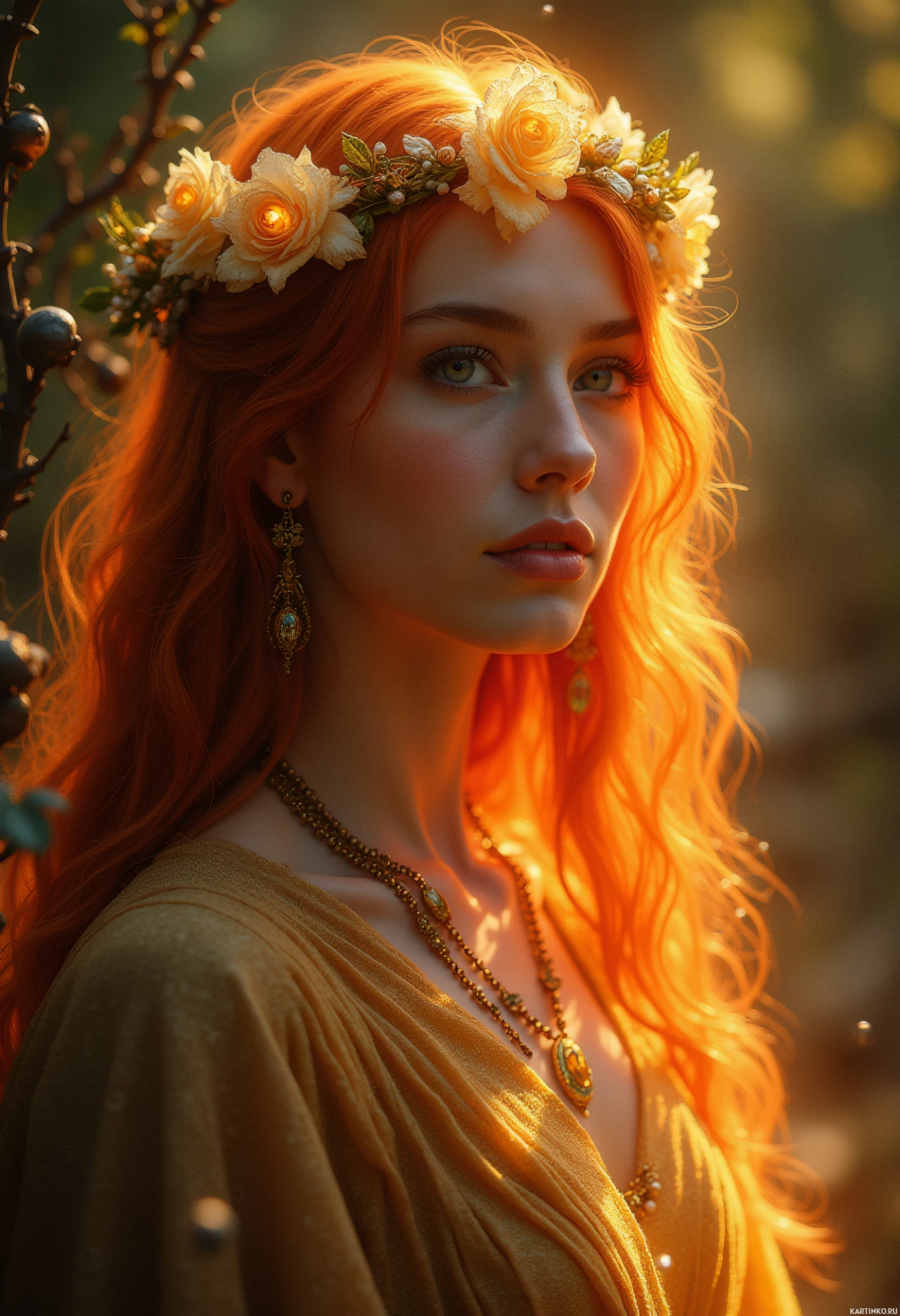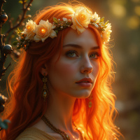 a flower crown which adds a touch of whimsy and fairytale-like quality to her look. Her attire complements her natural beauty. She is dressed in a flowing garment that drapes elegantly around her. The colors are soft and earthy tones, blending harmoniously with the surrounding nature. The background of the image consists of lush greenery, suggesting that she might be in a forest or a garden. The lighting is warm and seems to be either sunrise or sunset, casting gentle shadows around her and adding depth to the photograph. Overall, the image captures a moment of quiet introspection amidst a setting of natural beauty.