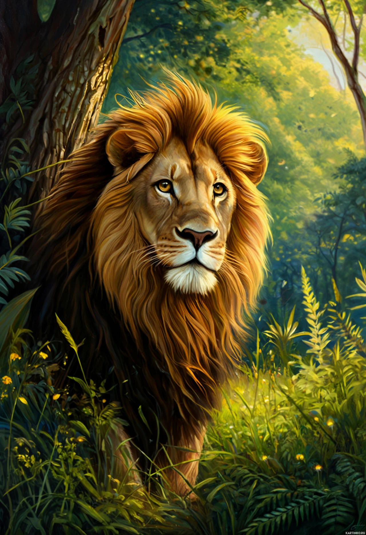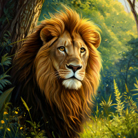 a majestic lion standing in a forest. The lion is the central focus of the artwork, exhibiting