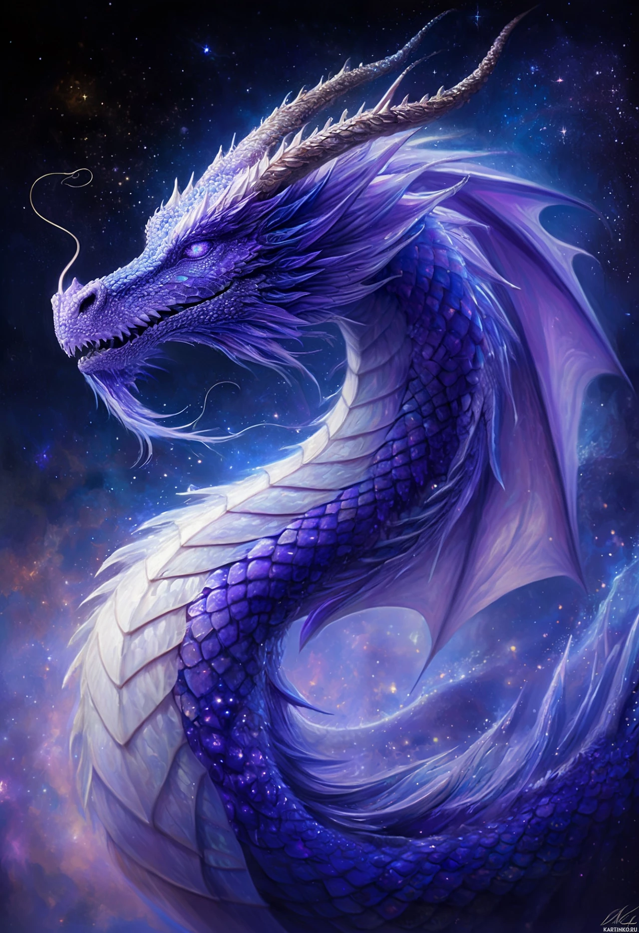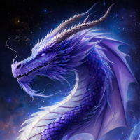 a fantasy dragon with an ethereal appearance. It features long flowing purple scales, white highlights suggesting