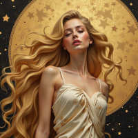 a state of contemplation or prayer. The background features an ornate celestial motif with stars and a crescent moon, enhancing