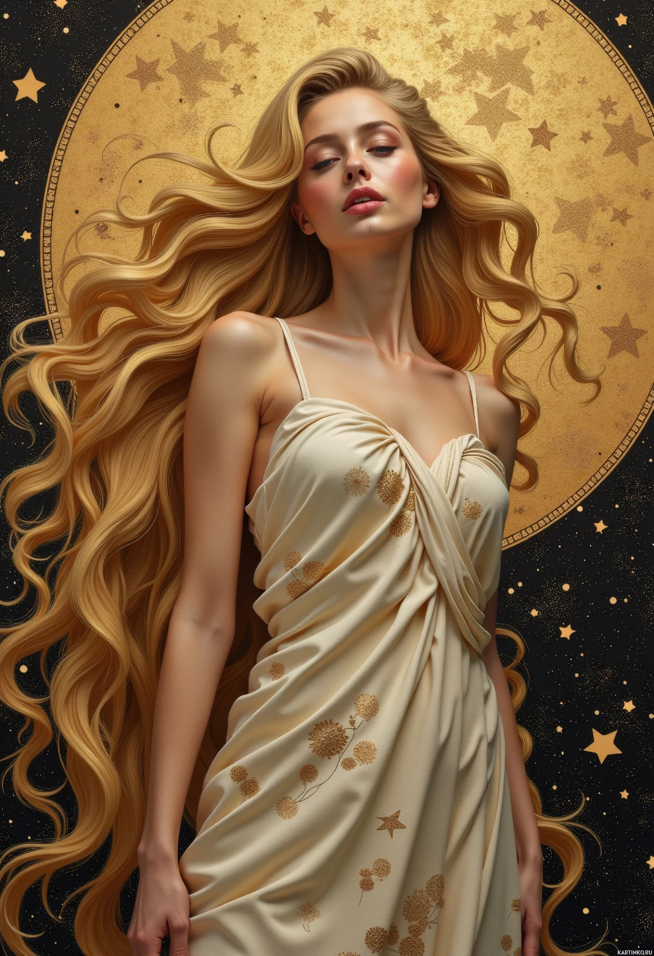 floral patterns, which suggests a classical or mythological theme. Her pose is serene and poised, with her hands gently placed over her heart, as if she is in