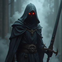 a dark cloak and hood, which partially obscures their face. Their left hand holds a sword with