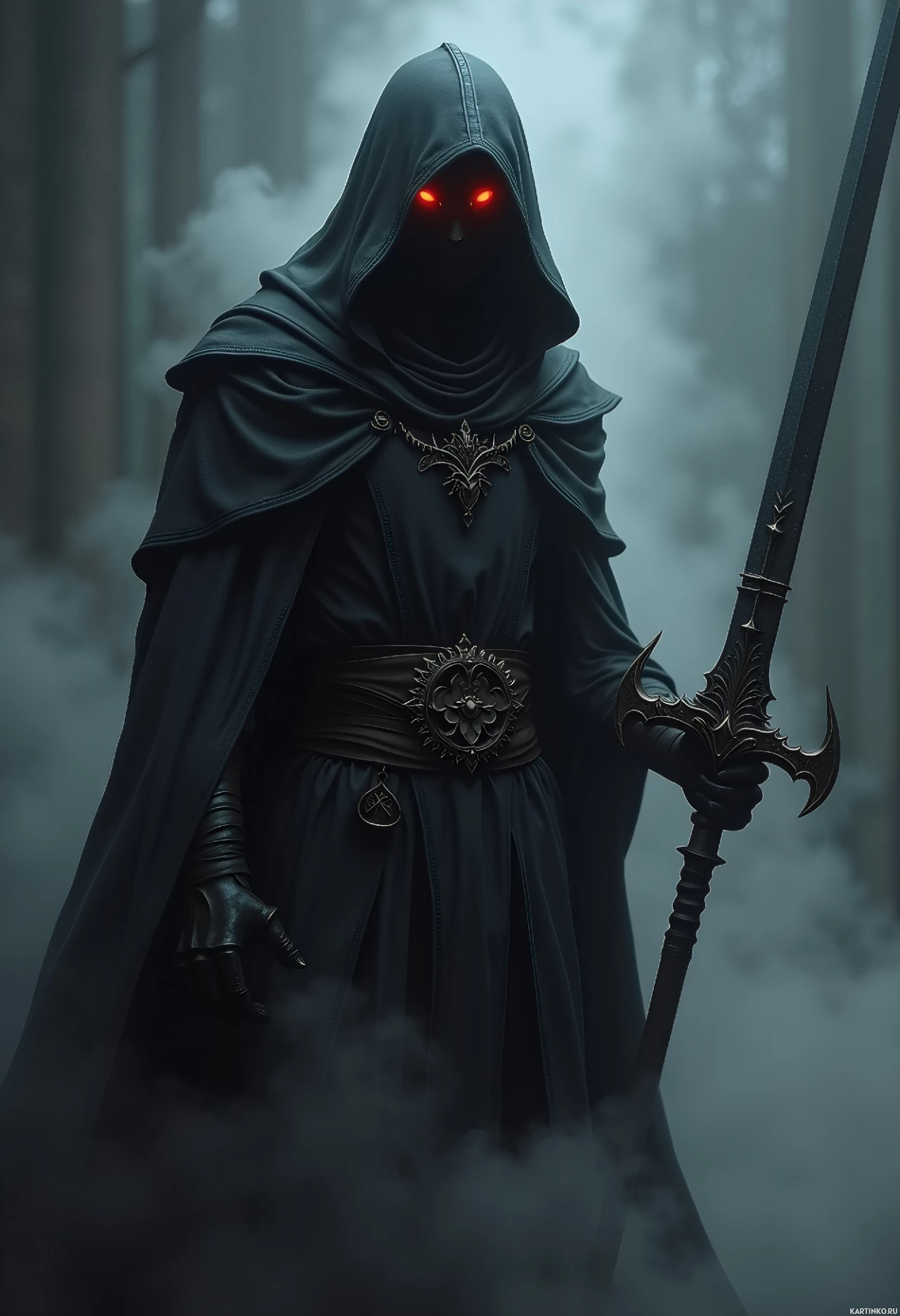an intricate design on the handle, suggesting it might have some significance or magical properties within the context of this character's storyline. The overall atmosphere is eerie and mysterious, fitting for what could be a fantasy or horror theme in media such as games, books, or films.