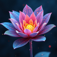 intricate layers and patterns, giving it a three-dimensional appearance as if it could be a digital rendering or illustration rather than an actual photograph. The central part of the flower exhibits pink hues with a contrasting yellow and orange center, while its petals are adorned with purple and black speckles that add to its luminosity against
